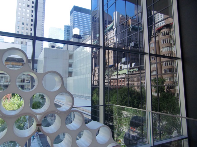es spiegelt sich der Baum, der eine Ebene höher ist und die Wolken in der Glasfront wieder