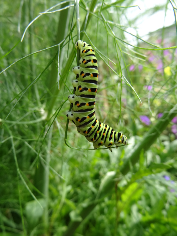 Bei der Beobachtung der Entwicklung lernte ich sehr viel über Schwalbenschwanzraupen, die am Anfang noch sehr unscheinbar aussehen und sich erst nach mehrerem Häuten zur farbenprächtigen Raupe entwickeln. Da hatte ich dann auch das Bedürfnis diese Schönheit in einem Foto festzuhalten.