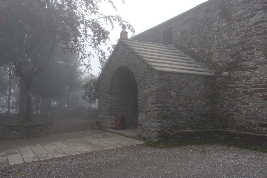 Pilgerrucksäcke am Kircheneingang auf dem Jacobsweg in O Cebreiro