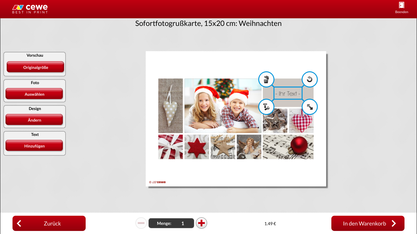 Wann ist ein besserer Zeitpunkt, um seiner Familie und seinen Freunden zu sagen, dass man an sie denkt, als zu Weihnachten? Denn Weihnachten ist schließlich das Fest der Liebe. Unsere CEWE CARDS eignen sich für eine persönliche Weihnachtsbotschaft natürlich sehr gut. Bestimmt kennen Sie schon unsere Produktauswahl auf der Internetseite oder in der Software. Doch was ist, wenn es mal schnell gehen muss? An unseren CEWE FOTOSTATIONEN können Sie Ihre Weihnachtskarten ganz schnell ausdrucken. Neben den vielen weihnachtlichen Designs, bieten die Sofortgrußkarten noch weitere Vorteile: