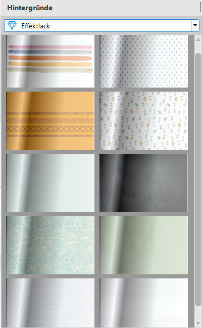 bei mir sind 10 Hintergründe mit Effektlack vorinstalliert. Einfach bei "Hintergrund" suchen, da erscheint eine neue Überschrift. Bei "Mehr" kann ich leider (noch) nichts mit Effektlack finden. Toll finde ich, dass bei den Clipart jetzt unten rechts ein kleiner Diamant für eine mögliche Veredlung angezeigt wird.Das wäre auch bei den Hintergründen sehr sinnvoll. LG Hellen Re: Digitaldruck, aber welche Veredlung??Vielen Dank, Hellen, dann warte ich bis Ö die Version 6.3 anbietet, bin schon gespannt.