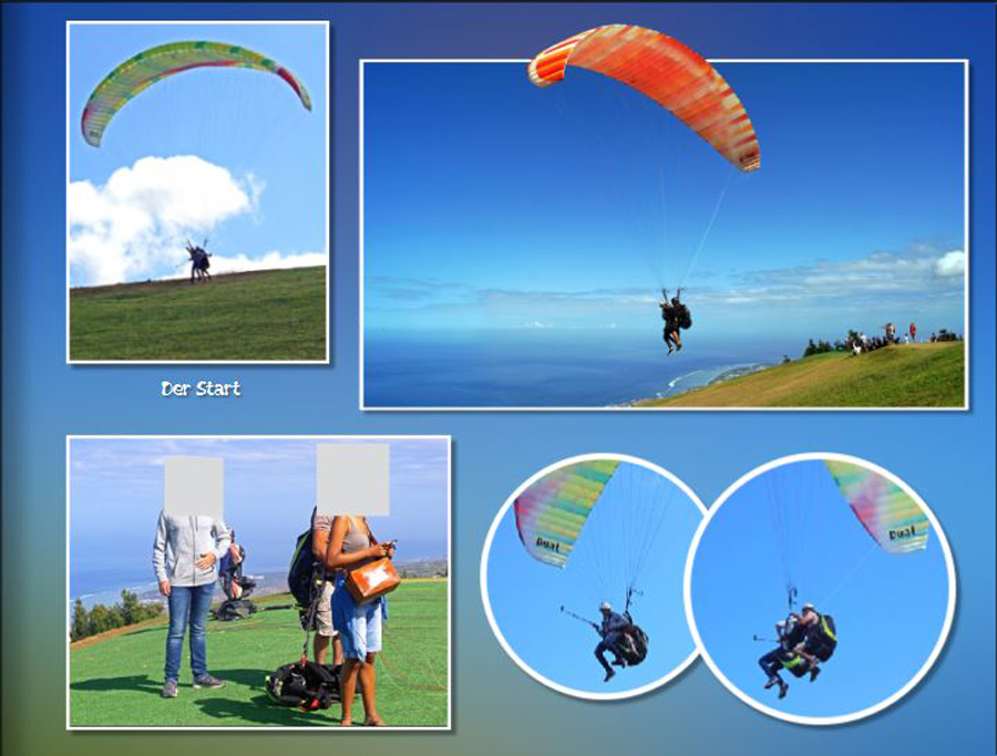 Als Alternative könnte ich mir auch die Personen und das Startbild gleich schmal untereinander. daneben das schöne Fallschirmbild und auf der rechten Seite dann vollflächig eines der Flugbilder. Evtl. rund das zweite davon noch (rund mit Rand?) kleiner einblenden - ob das gut aussieht, müsste man testen. Liebe Grüße