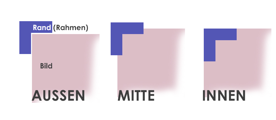 außen, mitte, innen bezeichnet die Lage des Randes relativ zur Bildfläche. außen: Der Rahmen (=Rand) liegt komplett außerhalb des Bildes. mitte: Der Rahmen liegt zur Hälfte auf dem Bild innen: Der Rahmen liegt innerhalb des Bildes.