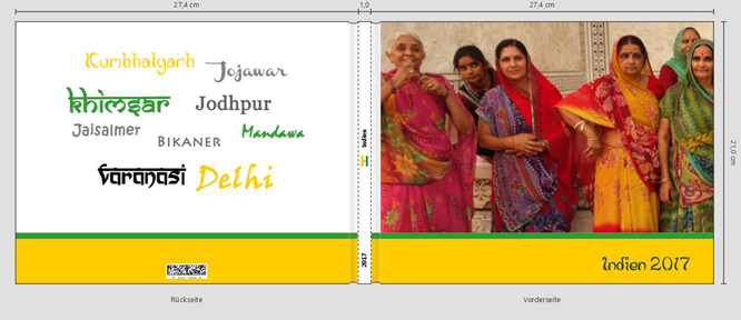 die Streifen sind die Farben und die Form der Landesflagge von Indien. Da ja nicht alle Flaggen Streifen unten und oben haben, habe ich nun die Streifen nach unten versetzt und die Breite der Streifen abgeändert. Die Breiten sind willkürlich gewählt. Ich habe das mal nach dem "Goldenen Schnitt" probiert, aber ich denke dann wird der Streifen insgesamt zu breit. Mit einer ruhigeren Farbe ist das ok (wie im Beispiel "Namibia"), aber in meinem Fall würde der Streifen dann zuviel von dem Bild nehmen. Die Schriftart "Brahmi" von "Indien 2017" habe ich im ganzen Buch verwendet. Sie ist auch auf der Rückseite im Ort "Kumbhalgarh" LG Anna Re: Buchrücken AufteilungNS: der linke Bildrand reicht bis an das Textfeld