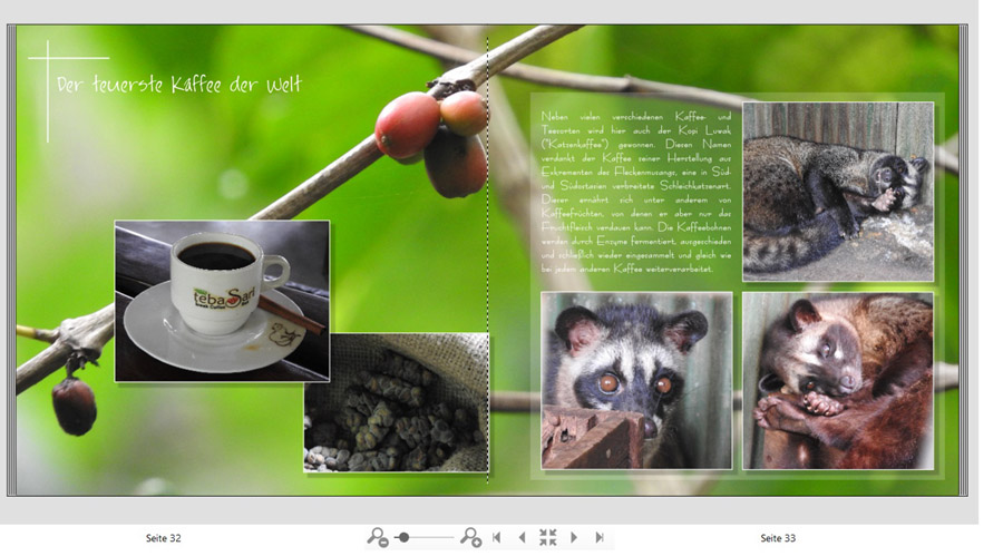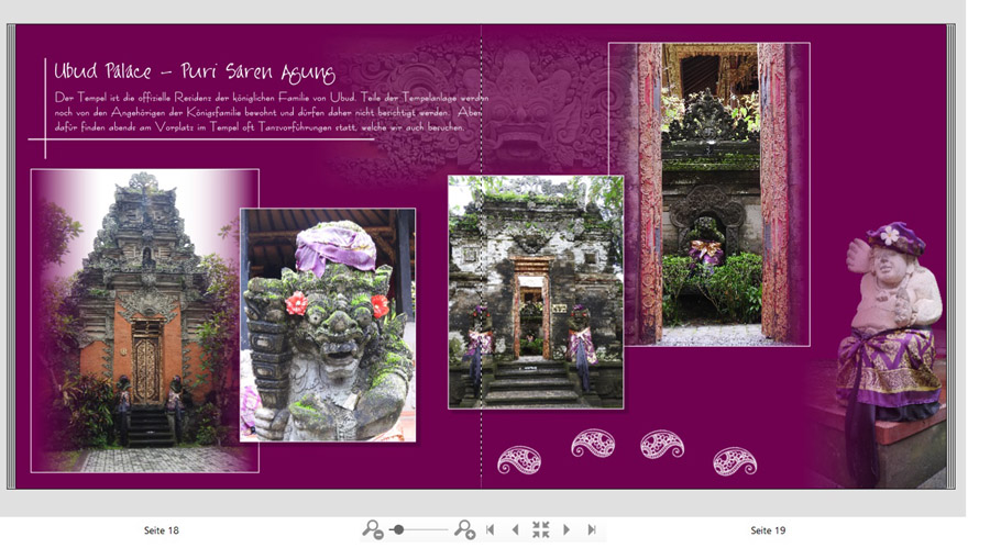 îch habe leider noch nie ein perfektes Fotobuch gestaltet, trotzdem möchte ich meinen Senf dazu geben. Ich kann nicht erkennen was auf dem Bild der Titelseite los ist. Für mich sollte das Foto größer sein -falls die Qualität okay ist (eventuell auch auf Vorder- und Rückseite ziehen). Es sieht soo schön aus. Auf Rahmen würde ich verzichten. Die weißen Rahmen auf schwarz wirken wie eine Traueranzeige - also gar nicht wie Bali. Die Schrift empfinde ich nicht passend für Indonesien. Seite 2 und 18: Ich mag Verläufe aber ein Verlauf auf bunten Hintergrund ist schwierig. Für mich ist es hier nicht gelungen. Der Text auf Seite 76 ist (für mich) nicht lesbar. Ich würde entweder den Hintergrund oder die Schrift heller gestalten. Das Design auf Seite 90: Nemo und die Schildkröte rechts finde ich super. Ansonsten gibt sind m.M. viel zu viele Fotos Du solltest Du überlegen ob Du auf das ein oder andere Foto verzichten kannst. Ich empfinde das Design als recht chaotisch. siehe Gestaltungsraster Vielleicht hilft Dir meine Mainstream Meinung trotzdem. Ich habe leider keine Ahnung wie ich mit Deinen Fotos spielen kann um Dir Vorschläge zu präsentieren. Ich bin sicher, dass Du tolle Vorschläge hier aus dem Forum bekommst. LG Annette