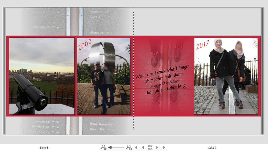 Nici Re: Seite auflockern?Die Seite mit dem London Eye finde ich recht gelungen, die mit dem Hotel weniger. Möchtest du dem wirklich eine Doppelseite widmen? Das Hotel sieht ja von außen recht nett aus. Wenn es die ganze Seite einnimmt, sehe ich keinen Grund es so transparent darzustellen, aber du könntest es von links nach rechts ausblenden lassen. Zimmerfotos, speziell von häßlichen Badezimmer, würde ich aber weglassen. Irgendwie sieh alles eher düster und traurig aus.