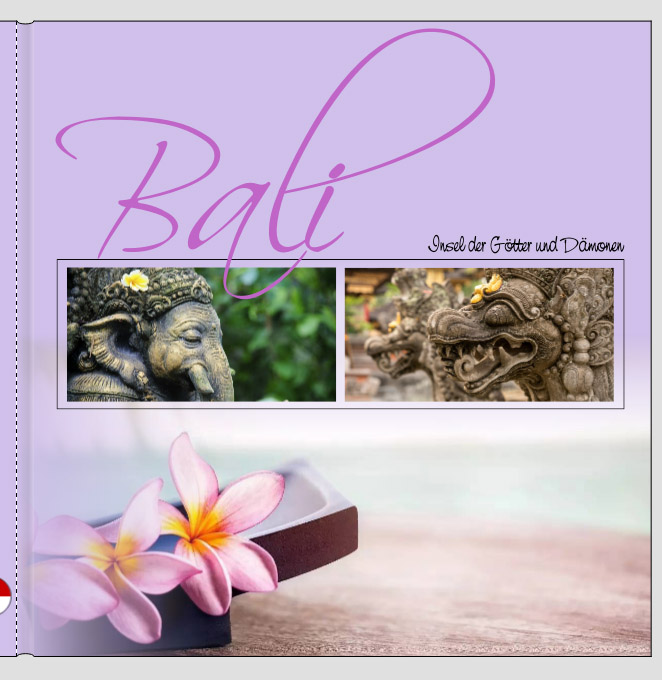 Mir gefällt der Text (fast) dort, wo er ist.1. Der Schriftzug sollte einen Tick höher gesetzt werden, sodass "G" und "D" etwas mehr Luft zur Linie haben. 2. Der Schriftzug sollte so weit nach rechts gerückt werden, dass der senkrechte Abstrich vom "n" nahezu bündig mit dem rechten senkrechten Strich des Rahmens ist. 3. Sofern Du 1. umgesetzt hast, sollte "Bali" nach unten geschoben werden, sodass beide Schriftlinien auf einer Höhe sind. 4. "Bali" steht zu weit rechts. Das ist eine optische Sache, probiere es aus. 5. Es käme auf einen Versuch an: "Bali" riesig setzen, dass das "l" oben im Anschnitt ist. Ich habe noch andere Veränderungsvorschläge: - Ist vom rechten Bild das Kinn vom Dämon vorhanden? Dann würde ich es zeigen. - Ich würde das "die" weglassen und schreiben "Insel der Götter und Dämonen". - Den Rückentext würde ich so schreiben: "Indonesien, Bali-Rundreise 2017". - Die beiden Fotos und damit die Texte würde ich aus der Mitte weiter nach oben schieben. - Die untere Blüte würde ich unten nicht anschneiden. Lieber Gruß, pitty