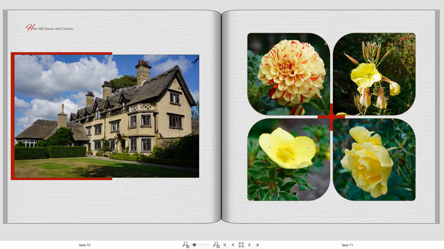 Den roten Hintergrund links auf der letzten Doppelseite würde ich wahrscheinlich gar nicht machen, da mir eine Entsprechung fehlt. In einer anderen Farbe passend zum Foto dagegen, könnte ich ihn mir links im Anschnitt und oben oder unten etwas größer zudem spannungsvoller vorstellen.