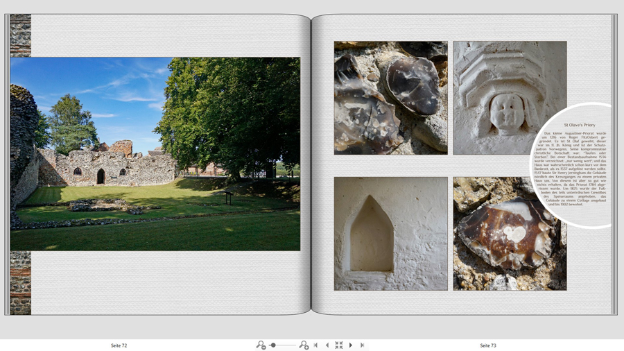 Ich bin anders als viele andere kein Fan davon, die Form von Fotos mit Masken zu verändern, egal, ob rund, halbrund, dreieckig usw.Daher beschränke ich mich auf meine Anregung zum Textfeld. Das Textfeld so zu setzen, war sicherlich sehr aufwändig. Durch die verkleinerte Ansicht hier im Forum fällt mir etwas auf, was Du in der Produktionsansicht vielleicht gar nicht bemerkt hast: Der rechte Rand wirkt durch die Trennstriche „ausgefranst“ und steht so im paradoxen Widerspruch zum recht gut gelungenen linken Rand. Wobei ich auch hier strenger wäre und die mittlere Zeile einen Tick nach links schieben würde. grasmuecke hat geschrieben: Was mir bei deinen Seiten aufgefallen ist, ist dass der obere Rand des gestalteten Seitenbereichs auf der linken und der rechten Seite immer unterschiedlich hoch ist. Für mich geht dadurch die Verbindung zwischen den beiden Seiten verloren. Vielleicht geht es nur mir so. Bin neugierig, ob das jemandem anderen auch auffällt.