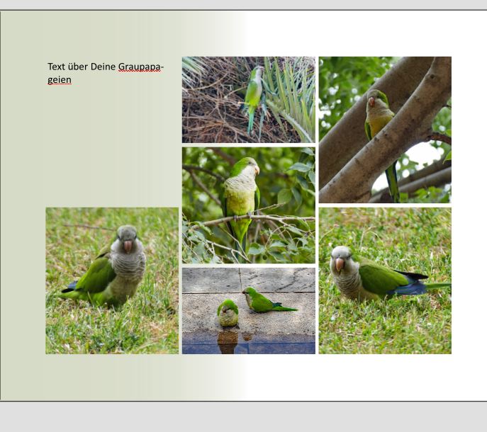 Re: Tierseite gestaltenEvtl. könnte man das untere linke kleine Foto mit out-of-bound bearbeiten, dass der Papagei hinter der Tür hervorguckt und der rest nicht zu sehen ist? Oder links und rechts ein großes Foto und in der Mitte kleine und den Text, falls es lay-flat-Bindung ist