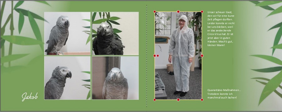 toll, wie sich deine Seite entwickelt hat. Mir gefällt auch die von den anderen favorisierte obere der neuen Versionen sehr gut. In den Anfangsversionen fand ich nicht so schön, dass Jakob auf den Bildern so unterschiedlich groß war. Die Angleichung jetzt gefällt mir gut. Vielleicht könntest du ihn aber oben links doch etwas kleiner machen, damit der rote Schwanz wieder zu sehen ist. Und darunter würde ich ihn ein bisschen mehr nach rechts rücken. Er darf ruhig angeschnitten sein, aber nicht so gequetscht Übrigens, das ist doch sicher total aufwändig mit so einer Quarantäne. Macht ihr das als Hobby oder beruflich? liebe Grüße