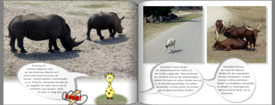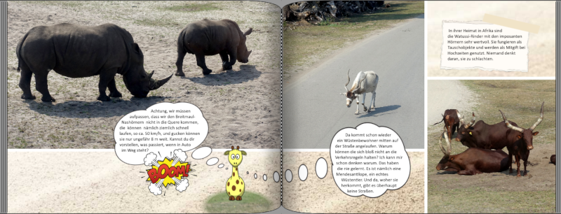 super Idee! Aber wie Pitty schrieb, sollte es Bild an Bild mit Rahmen gestaltet werden. Dann bekommt es den typischen Comic Look. Bei großen Formaten, siehe Nashörner, kann der Erzähler plus Sprechblase ruhig mit ins Bild. Bei kleineren Formaten könntest Du jeweils kleine "Comic-Bildchen", in denen der "Erzähler" agiert, daneben setzen. Aber alles seitenfüllend und mit Rahmen versehen. Schön wäre eine Figur in verschiedenen Positionen/Ausführungen. Dann sieht das nicht immer gleich aus, sollte der "Erzähler" zweimal auf einer Seite (Doppelseit) auftauchen. Du könntest den "Erzähler" nicht nur sprechen lassen, sondern auch mit Comic-typischen Denkblasen gestalten. Siehe Dromedare:" Ach du meine Güte, sind das Max und Moritz, die da im Gleichschritt angelaufen kommen?" Den Erklärtext dazu kannst Du dann in einer separaten Box unterbringen. Viele Grüße Re: Tierpark-ComicMir fällt dazu noch ein, dass ich das Buch auf jeden Fall bunt und fröhlich machen würde, auch mit vielen Comic-Zeichen, eins hast du ja auch schon drin. Und dein kleines Männlein finde ich als running gag richtig süß, das würde ich drin lassen und vielleicht mit den Tieren Dialoge führen lassen.