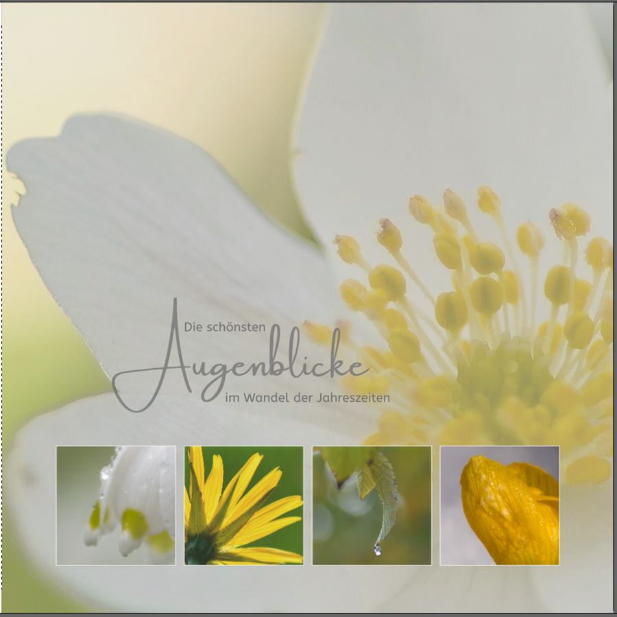 Re: Eure Meinung zum Cover und erste SeiteVielleicht wär es einen Versuch wert, die kleinen Bilder stark zu vergrößern, sodass nur ein Ausschnitt gezeigt wird. Ich meine nicht die Größe der Quadrate, sondern das Innere. Z.B. sodass von der Mohnblume fast nur noch Blütenblätter zu sehen sind.
