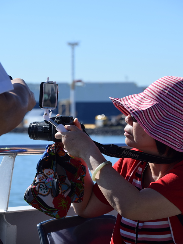 Auf der Fähre bei Aukland/Neuseeland war ich fasziniert davon, dass man auch synchron fotografieren kann, mit der Nikon und gleichzeitig mit dem Handystick. Chinesen sind wohl multitaskingfähig und haben damit den doppelter Durchblick.