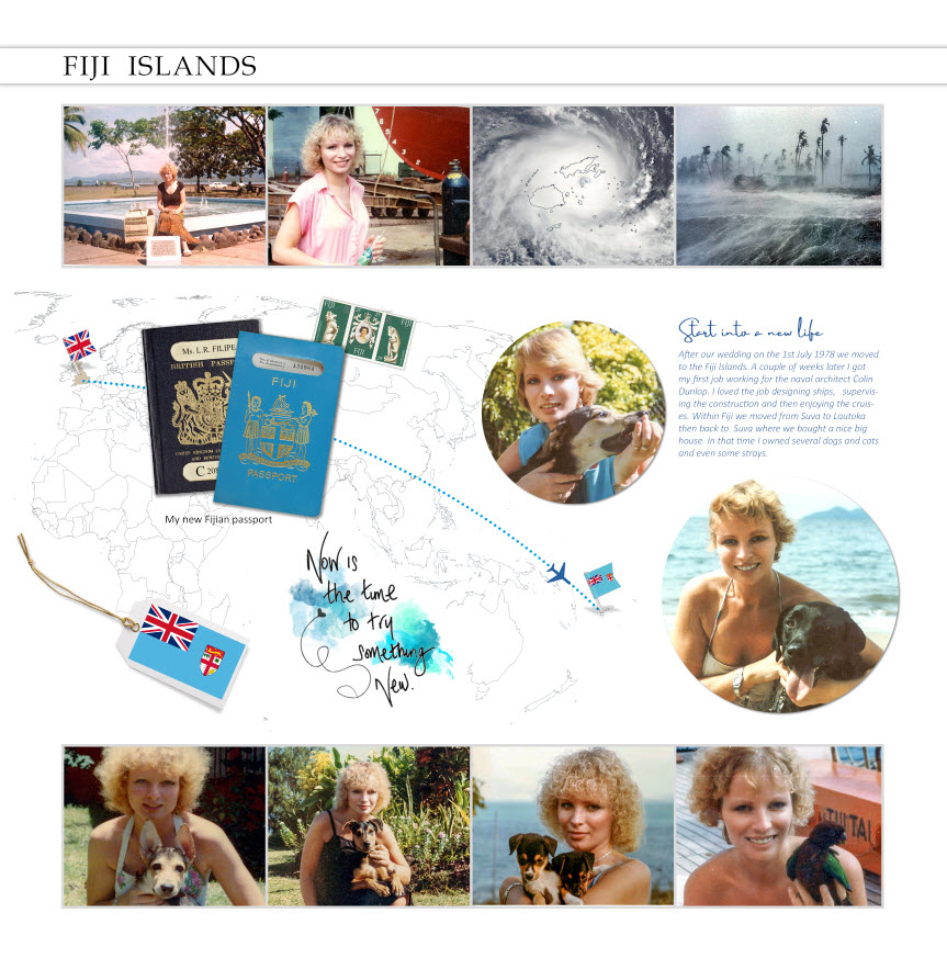 Das Buch ist eine Art Inhaltsverzeichnis für die echten Fotobücher, daher will ich, daß sich die Seiten ähnlich sehen. Aber eine Farbcodierung würde mir gefallen, wenn es nicht zu kitschig wird. Nur muß ich überlegen, eine Farbe pro Kontinent oder Land? Vielleicht verwende ich verschieden farbigen Schatten für die oberste Leiste mit dem Ländernamen.Eine andere Unterteilung würde sich aus deinem Lebenslauf ergeben. Wenn ich das recht verstehe, hast du in unterschiedlichen Ländern gelebt. Vielleicht könnten die Seiten über diese Länder ganz anders gestaltet sein; wahrscheinlich sind dort auch mehr biografische Texte und Fotos während die anderen Länder mehr auf Sehenswürdigkeiten ausgerichtet sind. Für Fiji würde ich vielleicht noch eine Doppelseite hergeben, da habe ich so viel erlebt. Habe Leute wie Prince Edward, Indira Gandhi, den Papst etc kennengelernt. Davon habe ich Pressefotos, habe aber keine Genehmigung zur Veröffentlichung, aber sie kommen in mein privates Buch. Es gibt auch viele Zeitungsausschnitte über mich, aber die habe ich schon im normalen Fotobuch. In der Nacht fallen mir immer mehr Geschichten ein…. grasmuecke hat geschrieben: