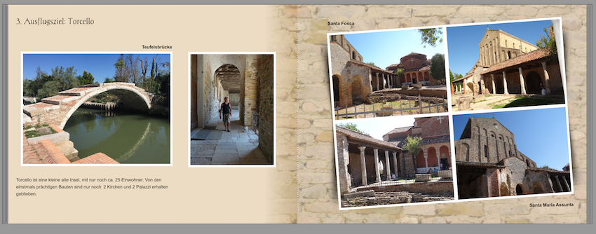 Vielleicht die Bilder links noch etwas größer, damit nicht zu viel freier Platz ist. Den Text noch bündig zum Fotorand. Was das "1. Ausflugsziel" angeht, bin ich immer noch der Meinung, dass es nicht nötig wäre. Aber das musst natürlich du wissen. Weiterhin noch viel Erfolg und zeige uns weiter deine Änderungen. Re: Mein FotobuchDas es Ausflugsziele sind, ist doch logisch. Warum schreibst du denn nicht nur: Torcello