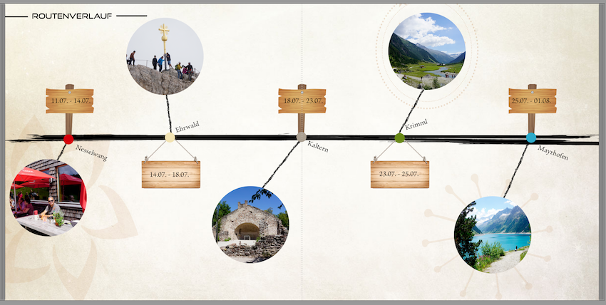 (Die Kreise sind mir dann doch zu unruhig.) An den Textumbrüchen würde ich noch ein bisschen zupfen, damit sich die Etappen hier jeweils nicht so nahe kommen. Ehrwald 2. Tag, Zeilenumbruch nach "und" 4. Tag, Zeilenumbruch nach "und" Kaltern 5. Tag, Zeilenumbruch nach "und" In den jeweils folgenden Zeilen ist noch genug Platz, um hier die zusätzlichen Wörtchen noch unterzubringen. Liebe Grüße