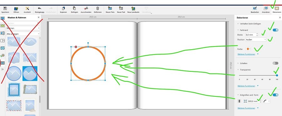 Ich glaube, ich weiß, wo Du hängst. Du darfst nicht von links einen runden Rahmen aus Masken&Rahmen auswählen (der wird tatsächlich auch transparent), sondern musst über die rechte Seite --> Dekorieren --> Farbrand den farbigen "Rahmen" gestalten, so wie ich Dir die Punkte hier mit grünen Rahmen markiert habe: Liebe Grüße