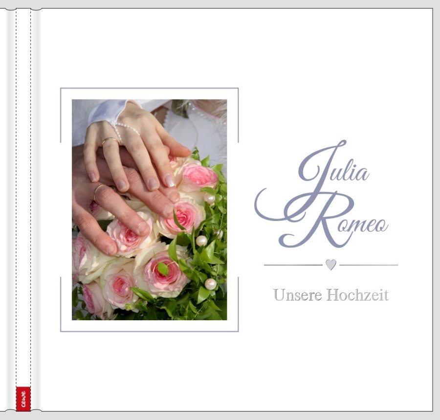 Herzlinie und "Unsere Hochzeit" habe ich dabei mit Veredelung ausgewählt. Ohne Veredelung wäre mir meine Initialen-Variante zu gedrängt. Da würde ich dann anders schieben. Außerdem habe ich Rahmen bzw. Farbflächen eingefügt, da mir das Cover sonst zu blass aussah. Das liegt aber mit Sicherheit auch an meinem Foto. Die tatsächliche Wirkung siehst Du natürlich mit Deinem Bild vom Brautpaar viel besser - auch mit den evtl. dann aus dem Foto gepickten passenden Farben. Ich habe jetzt einfach "...etwas Blaues" gewählt, weil es zum Spruch und zum Handschuh der Braut passt. D:wink: Und ob sich die Namen/Initialen des Brautpaars hübsch umschlingen lassen, musst Du halt auch mit den realen Namen ausprobieren. D:D