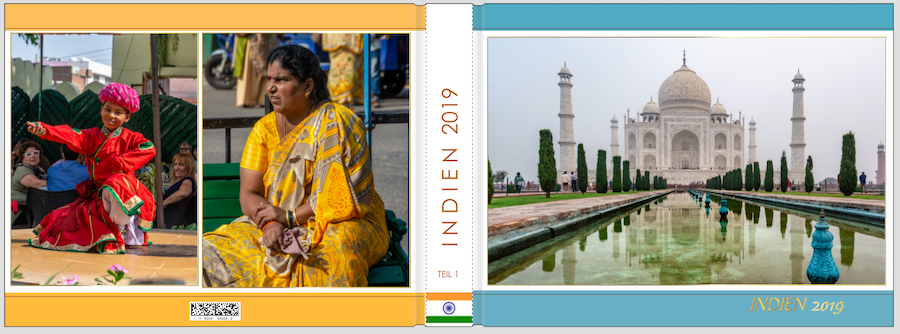 Ein Bild auf dem Cover gefällt mir grundsätzlich auch besser als zuvor zwei. Ich finde es nur schade, dass dadurch das Wasserbecken im Vordergrund fast komplett weggeschnitten wird und so die wunderbare Spiegelung des Taj Mahals, die man darin sehen kann, komplett verschwindet. Auf der Rückseite würde ich die Motive variieren und nicht zweimal ähnlich ausgerichtete Gebäudefassaden zeigen. Vielleicht hast Du auch Inder*Innen in ihren schönen farbigen Gewändern fotografiert und magst damit etwas kombinieren? Und eine Anmerkung noch zur Schrift. Scheinbar schreibst Du die Anfangsbuchstaben von z.B. "New Delhi" größer als die übrigen Buchstaben. Das kommt so in der gewählten (indischen) Schrift nicht vor und der versetzte Strich wirkt entsprechend unstimmig. Der Strich ist im originalen Schriftbild immer auf einer Linie. Wenn Du gerne Groß- und Kleinschreibung hervorheben willst, würde ich mich für eine grundsätzlich andere Schrift entscheiden. Schreibst Du im ganzen Buch im selben Orange-Ton? Hast Du mal probiert, dies pro Seite zu variieren und Orange- bzw. Brauntöne dabei aus den jeweiligen Fotos zu picken? Ich denke, das könnte stimmiger wirken. Liebe Grüße