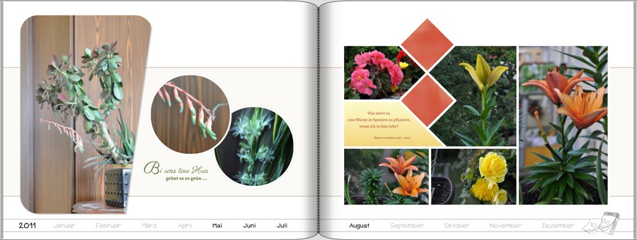 mir gefallen Deine gezeigten Seiten sehr gut. Auch die Monatsleiste finde ich gelungen. Den flatternden Kalender finde ich hübsch, aber ebenso wie phili glaube ich, dass die Seiten gewinnen würden, wenn Du ihn weglässt. Auch irritiert mich die Flatterrichtung der Blätter. Sie wehen zurück (nach links), während das Jahr in Richtung des Blätterns im Buch voranschreitet (nach rechts). Auf mich wirkt das subjektiv "verkehrt". Liebe Grüße