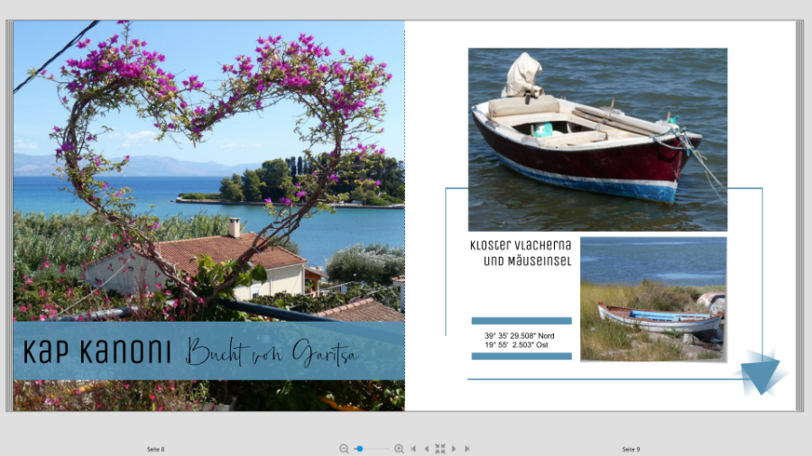 deine Seiten gefallen mir jetzt sehr gut. Einzig der Schatten hinter Schrift Pontikonisi stört mich. Bei den anderen Überschriften hast du auch keinen Schatten verwendet, wenn ich das richtig erkennen kann. Hier würde ich den auch weglassen. Lieber Gruß Traumfänger Re: Korfu - Bitte um Hilfe bei SeitengestaltungMir gefallen Deine Seiten ebenfalls sehr gut.