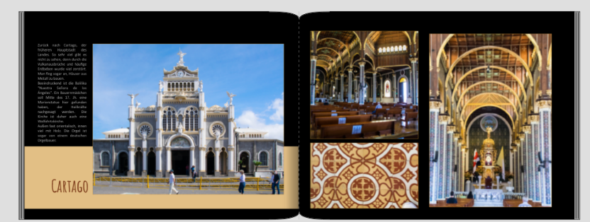 ich finde den weißen Hintergrund auch schöner und den Rahmen um die Beschreibungen finde ich durchaus passend. Auf der Seite vom Vulkan würde ich den Rahmen erweitern und die Beschreibung aus dem blauen Feld dazu nehmen, dafür den Schriftzug IRAZU VULKAN in das blaue Feld setzen, die großen Schriftzügen würde ich übrigens auf allen Seiten in die Farbflächen setzen und nicht mal so und mal so. LG Hans-Jürgen Re: Ich bräuchte auch mal wieder HilfeHallo Monika, ich liebe weiße Hintergründe oder auch eher zartfarbene. Wir waren zwei Mal in Costa Rica und ich habe mich damals bei der Gestaltung meines Costa Rica Buchs, für schwarze Hintergründe. Nach langem Hin und Her probieren kam ich zu der Auffassung, dass der schwarze Hintergrund die Wucht und Pracht der Farben von Costa Rica intensiver widerspiegelt als ein weißer Hintergrund. Ich habe dazu die Bilder mit zarten Rändern umfasst, deren Farbe ich aus den Bildern gewählt habe und immer mal so vermuschelte Farben hinterlegt. Muss dazu aber sagen, dass ich es auch nur bei diesem Buch so gesehen habe und sonst fast immer, oder sehr oft weiße Hintergründe verwende. Aber wie immer hier, nur meine persönliche Sichtweise. Es spielen ja auch eher die eigenen Vorlieben eine Rolle. Die farbigen Felder gefallen mir persönlich sehr gut und ja, bei nochmaligem Anschauen auch die schwarzen Hintergründe. Weißt du schon welche Bindung und welches Paier du für dein Buch wählen wirst? Würde mich freuen weitere Bilder zu sehen.