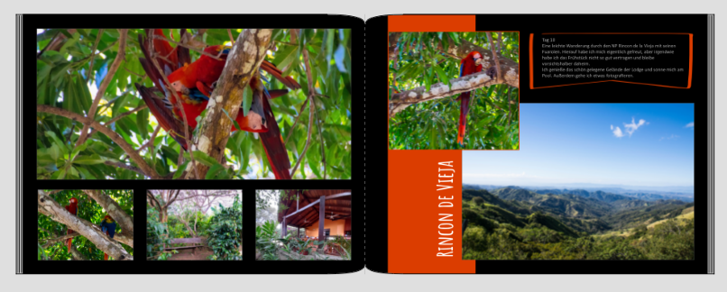Grundsätzlich gefällt mir weiß als Hintergrund besser. Aber bei der Seite mit den Vögeln und auch bei der davor gezeigten Seite mit der grünen Farbfläche finde ich schwarz in Kombination auch sehr schön, wenn nicht sogar schöner. Besonders knallige Farben knallen auf schwarz noch mehr. Das finde ich sehr passend zu Costa Rica. Und so frage ich mich: Warum für eine durchgängige Hintergrundfarbe entscheiden? Pass es doch je nach Gesamtgestaltung der jeweiligen Doppelseite an. Ich denke, das wirkt insgesamt trotzdem stimmig. Beim Rot der Vogelseite würde ich nicht dezenter, sondern noch knalliger arbeiten und ein tieferes satteres Rot aus dem Gefieder picken. Jetzt scheint es mir eher ein Orange zu sein. Harzluchs´ Vorschlag, die Überschriften immer innerhalb der Farbfläche zu platzieren, finde ich sehr gut. Das stellt dann auch wieder eine gewisse Einheitlichkeit in der Gestaltung dar. Was auch mich nicht anspricht, sind die Rahmen um einen Teil der Texte. Ich finde ihre Grundform nicht so schön und auch ihre Verzerrung je nach Textlänge nicht. Ich kann die Texte leider nicht lesen: Was unterscheidet denn die gerahmten von den ungerahmten Texten, weshalb Du sie optisch anders darstellen möchtest? Wäre es eine Idee für Dich, die jetzt gerahmten Textabschnitte in der Farbe der jeweiligen Farbblöcke auf der Seite zu gestalten und diese für eine bessere Lesbarkeit ggf. etwas dunkler zu ziehen? Oder wäre ein Kursivschnitt derselben Schrift, die Du für die anderen Textfelder verwendest, evtl. eine Option? Ich würde halt in keinem Fall den Fokus von den Bildern weg auf einen auffälligen Textrahmen lenken. Liebe Grüße