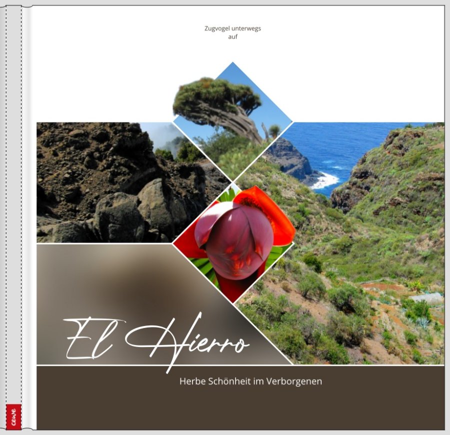 Cover El HierroHallo, nach einer urlaubsbedingten Pause geht es weiter mit meiner Buchgestaltung El Hierro. Die Insel ist klein, aber sehr vielfältig, schroff, karg, vulkanisch auf der einen Seite, grün mit Nebelwald auf der anderen Seite. Ich möchte gern diesen Kontrast auf dem Cover unterbringen. Ist das Rot des Weihnachtsstern vielleicht zu knallig?