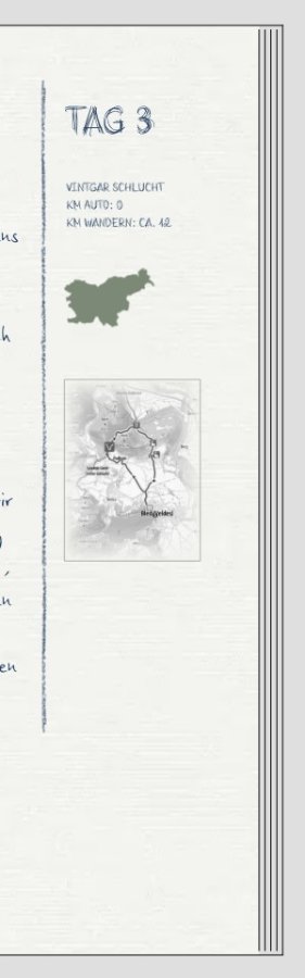 vielen Dank für Eure Ratschläge. Habe den Entwurf noch mal überarbeitet. @ Traumfänger, ich habe es mal mit dem Unterstrich probiert. Bin aber nicht so zufrieden. Habe jetzt das Clipart 68885 in 1,5 cm Höhe und grau genommen. Was meint ihr dazu? @ Genießer, danke für den Hinweis. Ich habe rechts und links jeweils 15 mm zum Rand bzw. Falz gelassen. Das war bei meinen vorherigen Büchern ausreichend. @ Spica, deine Tagebuchseite gefällt mir sehr gut. Dies werde ich mir merken. Bei meinem momentanen Projekt wird es mir aber zuviel. Ich habe 90 Tage. Davon voraussichtlich nur 1 bis 3 Doppelseiten je Tag Die Infos möchte ich gerne drinnen haben, sind aber nicht so wichtig, dass ich dafür eine 1/4 Seite verwende Datum, Temperatur °C, Zeichen für bewölkt, sonnig usw., Ort bzw. von bis, gefahrene km, Campingplatz oder Hotel @ Reisetante, ich hab noch ein bisschen aus dem Foto heraus gezoomt, so dass nur noch ein kleiner Teil des Flügels zu sehen ist. @ Monika, ich werde noch mal meine Fotos durchforsten, habe aber nicht allzu viele. Ja, eigentlich sollte man bei schlechten Wetter mehr Fotos machen. Den Text habe ich jetzt mal als Blocksatz gesetzt. Werde aber nochmal darüber nachdenken. Liebe Grüße Asiafan