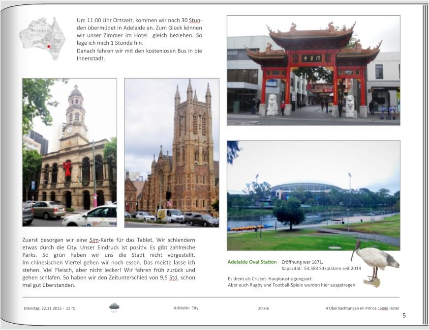 Du willst 90 Tage in einem Buch unterbringen? Wow, diese Selbstbeschränkung könnte ich nie aufbringen! Respekt! Dein herangezoomtes Bild gefällt mir viel besser! Aber warum ich hier eigentlich einen Kommentar abgebe: Mein Sohn hat in der Schule gelernt, dass man die Zahlen von eins bis zwölf in Texten immer in Worten schreibt. Das ist mir bei deinem "lege mich 1 Stunde hin" eingefallen. Dass bei der Erläuterung zu Adelaide bei "Australiens" zweimal das "s" zu viel ist (Genetiv?), hättest du sicher beim Korrekturlesen selbst gemerkt ... Ich würde übrigens dieses Textfeld bündig mit dem Bild darunter abschließen. Und die Stunden beim Zeitunterschied würde ich - wenn genug Platz ist - nicht mit "Std." abkürzen. LG Basilikum