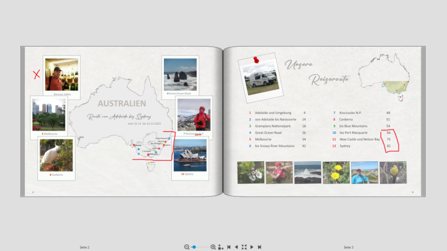 Re: Warenkorb kann nicht abgespeichert werdenBeim Cover sieht man ganz deutlich, dass deine Änderungen nicht übernommen wurde, denn die Flagge z.B. hat du erst später eingefügt, auch das Bild in der Australienmaske hast du erst später verchoben und auch die Textfarbe ist anders. Ich befürchte, dass es auch so gedruckt wird. Trotzdem hoffe ich, dass es ok sein wird.