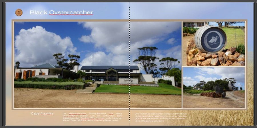 mir geht es ähnlich wie DSL-schnell. Die Hintergründe sind mir zu dominant, zu dunkel. Ich würde bei den Fotoseiten den Hintergrundfotos deutlich mehr Transparenz geben. Diese Bilder sollen ja eigentlich nur die Seite abrunden und die eigentlichen Fotos unterstreichen. Aktuell rücken mir die Hintergründe zu sehr in den Fokus. Bei der Rahmengestaltung würde ich es einmal umgekehrt probieren: fetterer Gesamtrahmen in weiß und außen ein schmaler, zarter farbiger Rahmen. Ich denke, dass unterstreicht die Fotos mehr als die aktuell gewählte Kombination. Und die Fotos heben sich dann auch nochmals mehr vom Hintergrund ab. Die Idee mit den Korken beim Inhaltsverzeichnis gefällt mir. Die Boschendal-Seite würde ich ausdünnen und eher wie Babylonstoren gestalten. Momentan hast Du hier 3x Weinflaschen aus derselben Perspektive und 2x nur wenig unterschiedliche Hausansichten. Für die Zitronen (?) auf der letzten Seite würde ich einen Viertelkreis mit weicherem Verlauf wählen. Und schau hier mal nach der Ausrichtung. Die Komposition der 6 Bilder würde ich weiter nach links rücken, sodass der weiße Rahmen zwischen Vogel und Tor genau mittig auf dem Falz liegt. Auch die Bildgrößen oder Rahmungen scheinen auf dieser Seite ungleich zu sein. Ich sehe da teilweise Versatz. "5 Babylonstoren" würde ich auf die rechte Seite rücken und dort linksbündig mit dem unteren Text ausrichten. Ich hoffe, das war Dir jetzt nicht zu viel Herumrückerei ... Liebe Grüße