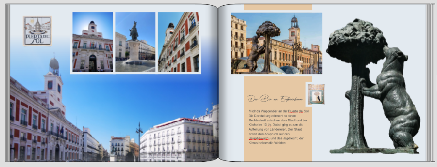 habe mich gerade mit deinen Seiten vom 7.11. beschäftigt, das fertige Cover finde ich gut, auf der ersten Seite irritiert mich der hellere 4 eckige Fleck hinter dem Flügel und auf der rechten Seite vom ersten Tag sind die Personen irgendwie in die Länge gezogen. Auf den Folgeseiten vom 13. stört mich ein weninig der Verlauf am Foto mit dem Springbrunnen. Fotos, die in Farbflächen hineinragen würde ich wohl durchgängig entweder mit oder ohne den weißen Rand gestalten. LG Hans-Jürgen Re: Bitte um HilfeDanke für eure Meinung und Hinweise ! Einiges schon geändert