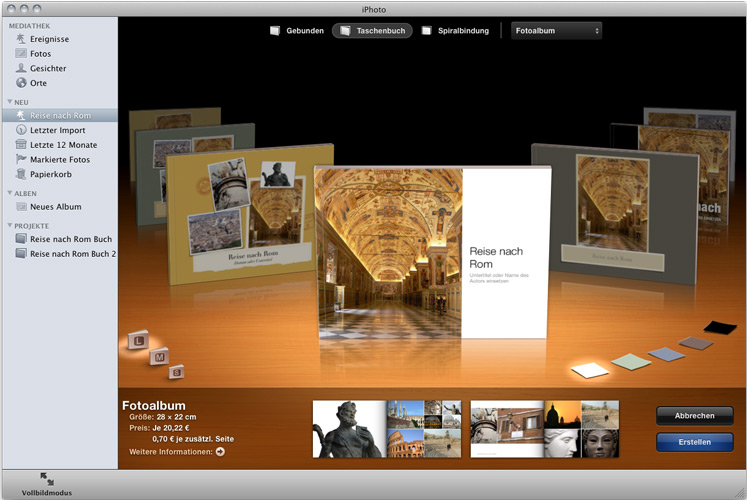 Mit iPhoto bietet Apple allen Mac Usern ein intelligentes Werkzeug zur Erstellung von Fotobüchern. Und das Beste daran: Sie können Ihr gestaltetes Fotobuch als PDF exportieren und im Anschluss ganz einfach als Hardcover in gewohnter viaprinto-Qualität bestellen. Wie das geht? Wir zeigen es Ihnen: Erstellen Sie mit iPhoto Ihr individuelles Fotobuch als „Taschenbuch“ im Format „L“. Stellen Sie Ihre schönsten Momente individuell zusammen und speichern Sie Ihre Daten als PDF. Dazu wählen Sie unter Ablage > Drucken > Papierformat > Papierformat anpassen. Bestimmen Sie die Werte für Breite und Höhe mit 20,5 bzw. 27,0 und belassen Sie die Angaben für den nicht druckbaren Bereich „Benutzerdefiniert“ auf null. Durch Klick auf PDF > Sichern speichern Sie die Datei auf Ihrem Rechner. Damit haben Sie Ihr Fotobuch erfolgreich aus iPhoto exportiert. Auf viaprinto.de können Sie die Daten jetzt einfach online hochladen. Wählen Sie als Produkt ein Hardcover A4 quer und bestimmen Sie weitere Parameter wie Papier und Farbigkeit. Die einzigartige viaprinto-Vorschau zeigt Ihnen schon vor Produktionsbeginn das fertige Endprodukt. Schauen Sie selbst: Ihr iPhoto-Buch auf viaprinto.de Sylke Wer ist online?Mitglieder in diesem Forum: 0 Mitglieder und 20 Gäste