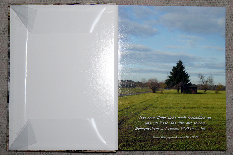 ich habe immer eine Rolle Einband-Folie zu Hause - ich binde inzwischen alles ein, was nach Buch aussieht. || Sobald ein Fotobuch angekommen und für gut befunden wurde, wird es in Folie gepackt. Ich habe das letzten Winter mit den Fotobüchern begonnen, nachdem die Ecken bei den Softcover-Büchern ziemlich unschön aussahen. In einer Gewaltaktion habe ich über 70 Exemplare eingebunden und das konsequent beibehalten. Grüßle von der Silber-Distel! So sieht das bei meinem Jahrbuch 2014 aus: Zugegeben sieht es beim Aufschlagen nicht so prickelnd aus, aber es ist auf jeden Fall wirkungsvoll. Liebe Grüße