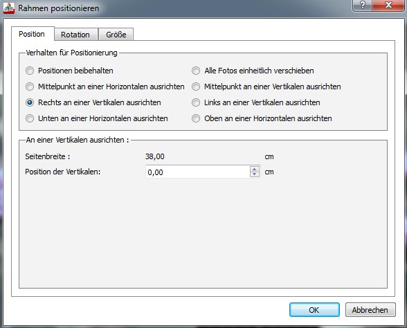 Es geht um diese Thematik:http://www.cewe-fotobuch.de/forum/viewt ... 447#p55447 Aufgerufen werden kann es u.a. durch das Kontextmenü "Objekt positionieren". Angezeigt wird dann allerdings "Rahmen positionieren". Die jeweilige Wirkung kann man eigentlich nur durch Versuch und Rückgängigmachen herausfinden. Als vernünftige Alternative kommt momentan eigentlich nur das variable Raster mit Einrastfunktion in Frage. Wenn es in Ergänzung dazu dann noch die automatischen Ausricht-Hilfslinien gäbe, wären die meisten Positionierungs-Fragestellungen damit schon im WYSIWYG-Prinzip (what you see is what you get) zu bewältigen --> http://www.cewe-fotobuch.de/forum/viewt ... f=2&t=6044 Re: Stimmen Sie zu Programm Verbesserungen abUnd so beißt sich die Katze in den Schwanz. Weil