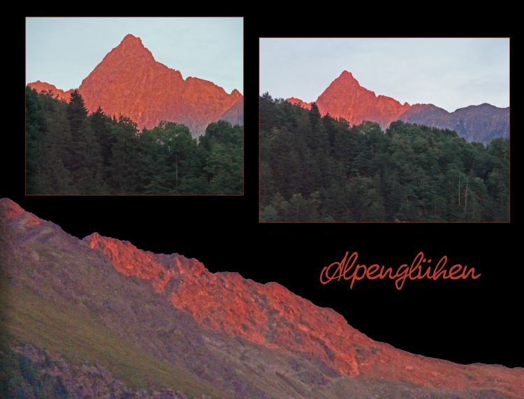 Folgende Bilder sind rein zufällig aus einem Restaurant heraus entstanden :) Wir saßen mit dem Rücken zum Berg, als mir auf einmal dieses unglaubliche Rot auffiel. Sofort die Kamera gezückt ... In insgesamt 3 Wochen gab es dieses Phänomen leider nur einmal Im Fotobuch habe ich im Bild unten den Berg freigestellt. Das ist eine der wenigen Seiten, die ich mit einem schwarzen Hintergrund gestalte. Es wird voraussichtlich die letzte Seite im Buch :) Schwarze Hintergründe sind durchaus interessant. In meinem Beispiel hätte ich keinen anderen passend gefunden. LG