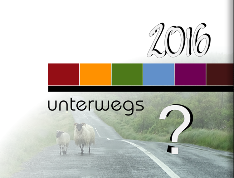 Seit einigen Jahren gestalte ich Jahrbücher zu unseren Kurzurlauben, Ausflügen etc., die alle den Titel unterwegs 20xx haben. Die Ereignisse sollten sich durch kräftige Farben voneinander unterscheiden. Duch Pittys Ausführungen über Linien in ihrem TG angeregt, kam mir die Idee, den Einband in Anlehnung an Mondrian zu gestalten. Die Farben finden sich im gesamten Buch und auf der ersten Seite, die den Titel wiederholt und genauere Angaben zu den besuchten Orten macht. Als Frontispiz (ich hoffe, ich habe es richtig verstanden, dass es sich hierbei um ein Foto auf der ersten Seite handelt) habe ich die Dame gewählt, weil sie so neugierig schaut, wo wir denn heuer unterwegs waren. Ich zeige euch gleich noch die letzte Seite, die ähnlich wie die erste gestaltet ist, nur mit einem Ausblick auf das kommende Jahr. Da ich mein Buch erst bestellen werde, würde ich mich über Kommentare/Kritik/Verbesserungsvorschläge freuen. Liebe Grüße und allen hier im Forum ein glückliches Jahr 2016 Yorck Liebe Grüße