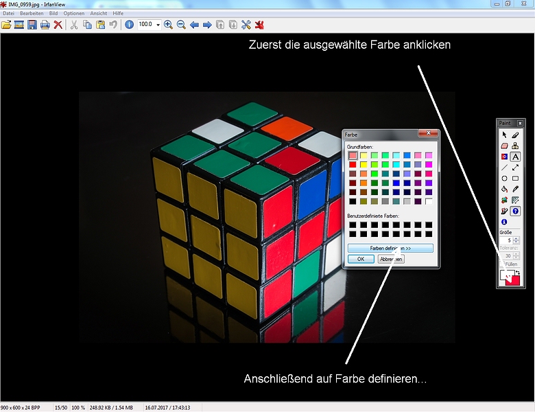 Re: Anleitung einfarbiges Bild erstellen bei/mit PaintBei IrfanView kannst du nichts falsch machen... direkt vom Homepage, dann die Plugins dahinter, und ferig. Einen Defender oder MSE (Microsoft eingebaute Antiviren-SW) oder anderen Viruskiller wirst du doch wohl sicher haben (ohne das sollst du nicht mal browsen oder Mails lesen). Und: Übung macht alle Meister