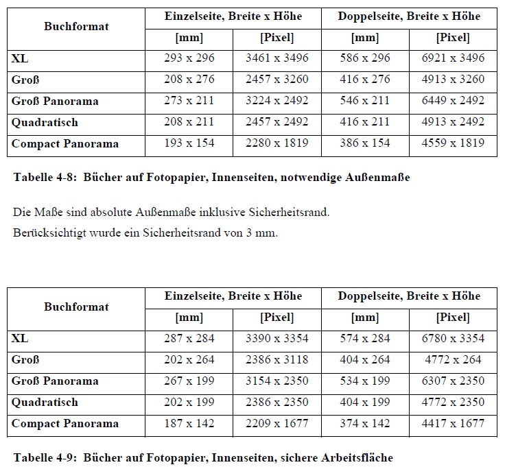 ich möchte die Seiten der Fotobücher frei in Photoshop gestalten und diese als formatfüllende JPEGs einbinden. Wo finde ich die entsprechenden optimalen Pixelabmessung ... und die Angaben zum Rand? Es geht um ein Groß Panorama (Fotopapier matt) und XL (ebenfalls Fotopapier matt). Danke und Grüße Thomas Re: Auflösung für HintergründeIch habe noch keine Bücher auf Fotopapier erstellt, aber für Digitaldruck brauchst du für Größe XL 3437 x 3496 Pixel für die EZ, 6874 x 3496 Pixel für die DZ und 7465 x 3732 Pixel für das Cover bei 154 Seiten. Zu beachten ist der Verschnitt und am Cover für das Papier, dass eingeschlagen wird, also nicht zu knapp am Rand platzieren. Am Besten eine Musterseite als jpg abspeichern, in das Buch einfügen und die Vorschau ansehen, so wird es dann auch gedruckt.