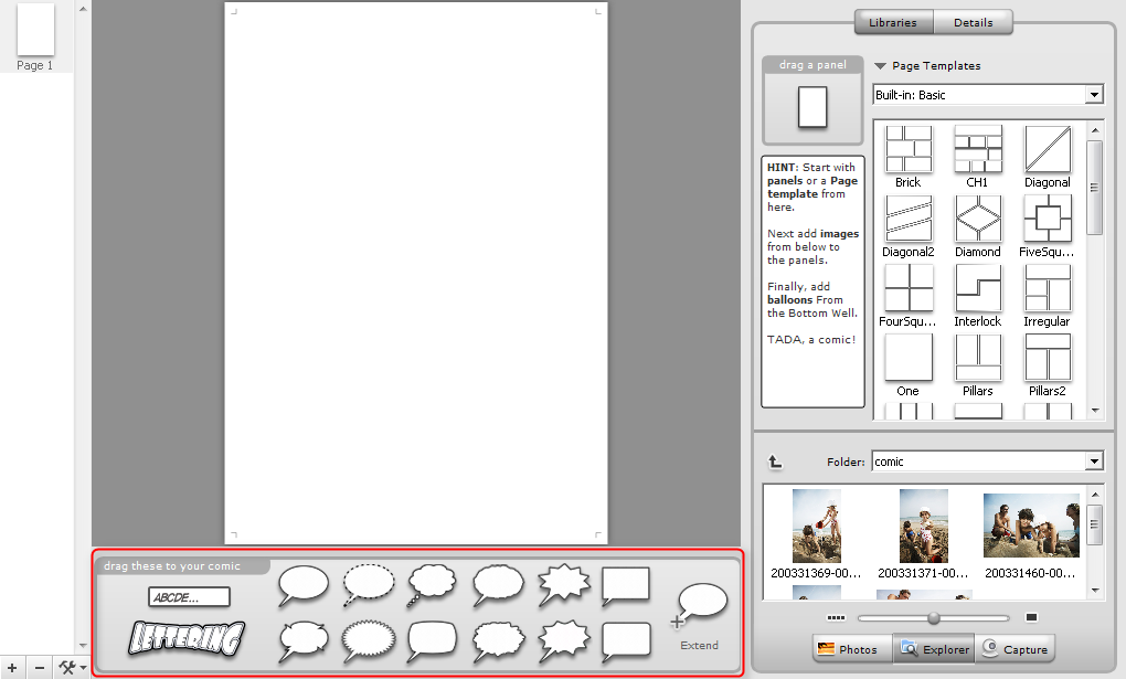 Textblasen und –felder finden Sie unterhalb der zu gestaltenden Seite. Ebenso wie Bilder und Layouts lassen sich diese in die zu gestaltende Seite ziehen. Mit einem Doppelklick in das hineingezogene Feld können Sie anschließend den gewünschten Text hineinschreiben.