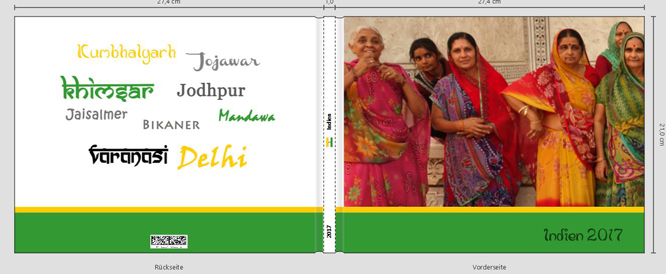 die Streifen sind die Farben und die Form der Landesflagge von Indien. Da ja nicht alle Flaggen Streifen unten und oben haben, habe ich nun die Streifen nach unten versetzt und die Breite der Streifen abgeändert. Die Breiten sind willkürlich gewählt. Ich habe das mal nach dem "Goldenen Schnitt" probiert, aber ich denke dann wird der Streifen insgesamt zu breit. Mit einer ruhigeren Farbe ist das ok (wie im Beispiel "Namibia"), aber in meinem Fall würde der Streifen dann zuviel von dem Bild nehmen. Die Schriftart "Brahmi" von "Indien 2017" habe ich im ganzen Buch verwendet. Sie ist auch auf der Rückseite im Ort "Kumbhalgarh" LG Anna Re: Buchrücken AufteilungNS: der linke Bildrand reicht bis an das Textfeld