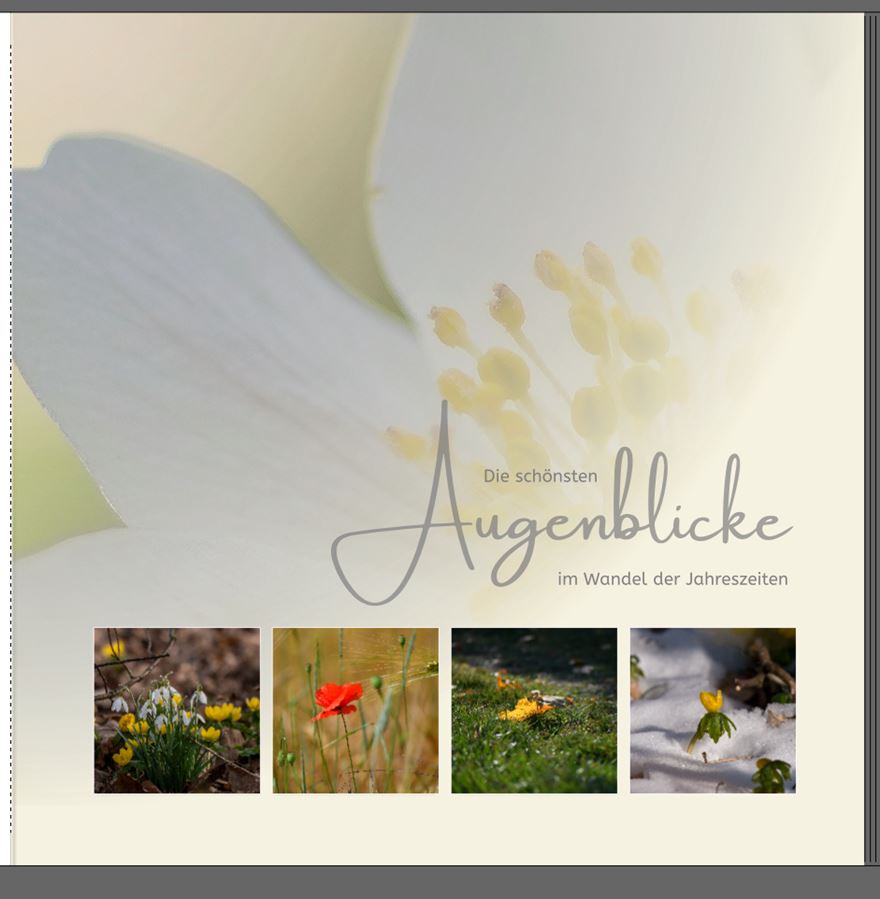 Die Cover-Fotos in der von dir vorgeschlagenen Farbgebung sähen sicher toll aus - aber ich habe keine derartigen Bilder. Jede Jahreszeit hat ihre ureigenen Farben - und so abändern kann/mag ich nicht. Und vier Bilder derselben Zeit sind wohl nicht besonders spannend. hat geschrieben: ‚Die Rückseitentransparenz stört (wieder) die Titelseite‘.Wie meinst du das genau? Ich habe beide Coverbilder genau bis zum Falz ihrer Seite gezogen ( also nicht überlappend ) und auch die Transparenz der Rückseite noch angehoben. Ich häng' nochmal ein Screenshot an. Ich bin wirklich am Überlegen, ob ich die vier Jahreszeiten nicht doch auf die 2. Seite lege. Bei soviel Input und schönen Vorschlägen brauche ich wohl etwas länger bis zur Entscheidungsfindung Re: Eure Meinung zum Cover und erste SeiteSchmidti hat geschrieben: Die Cover-Fotos in der von dir vorgeschlagenen Farbgebung sähen sicher toll aus - aber ich habe keine derartigen Bilder.