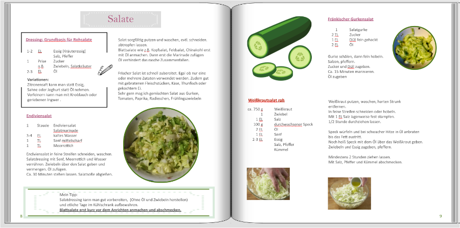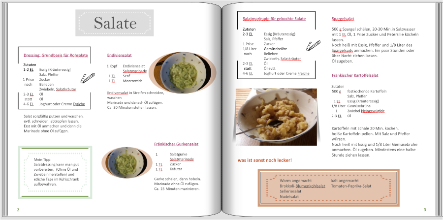 Auf den ersten Blick: Mich stört die Ausrichtung der Zutaten. Da bin ich inzwischen etwas pingelig geworden. Entweder nach rehts oder nach links oder mittig - aber immer gleich. Am besten: 3 Spalten, 1x für Anzahl, 1x für Einheit und 1x für Zutat. Macht Arbeit ist aber später super übersichtlich. (Siehe Bild) Salate: Ja, es ist ein Unterschied zwischen Rohsalat und Gegarter Salat (da kommt die HW-Lehrerin durch). Aber die Abwandlungen verwirren nur. Kennst du das Bayer. Kochbuch? Ich hatte es in der Schule, habe es aber gehasst, weil es für mich das "Oder"-Kochbuch war. So viele "oder dies oder das". Schreib das Grundrezept und darunter " Variationen: Zitronensaft statt Essig, Sahne oder Joghurt statt Öl......." Schau dir nochmal die Zutatentafeln an, da steht "nach" in der Spalte 1 und "Belieben" beim Text. Beim Spargelsalat hast du plötzlich keine Spalten sondern Fließtext. Warum bei den Marinaden dann nicht einfach eine Auswahl an Salaten? Z.B. Rohe Salatmarinade für Kopfsalat, Gurkensalat, Tomatensalat, Paprikasalat. Gekochte Salatmarinade für Kartoffelsalat, Selleriesalat, Rote Bete Salat, Bohnensalat. Als Tipp vielleicht: Gekochte Salate heiß marinieren und lang durchziehen lassen, Rohe Salate kalt marinieren und kurz durchziehen lassen. So, dann das Gestalterische: Ich würde die Bilder einheitlich rahmen. Oval, Schatten, Rahmen - das ist zu viel. Ich habe das zwar selbst auch gemacht, aber da war es eher ein Buch mit Scrap-Charakter, das ist bei dir nicht. Eine Einheitlichkeit würde ich durchs ganze Buch ziehen, z.B. wie bei den Salaten, da hast du den unterbrochenen Rahmen für die Zutaten, da weiß man gleich, wo man hinschauen muss. Die Zubereitung vielleicht dann daneben oder darunter und die Tipps bzw. Variationen auf Farbflächen oder Farbrahmen. Überschriften immer gleich und in der gleichen Größe. Gestaltung bringst du gut mit Farbflächen und Einheitlichkeit ins Buch. Vielleicht kannst du auch die Überschriften "Salate, Nachspeisen...." in einer schönen Zierschrift schreiben, das gibt auch eine gestalterische Note. Mein Auge hüpft immer hin und her, es sollte Ruhe finden. Ich hoffe, das war nicht zu viel Senf Monika Re: Projekt KochbuchHallo zusammen,