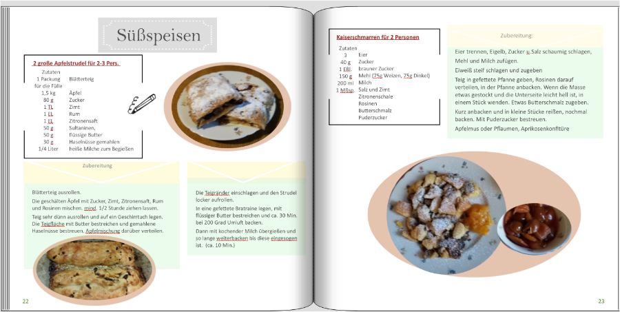 Weihnachten ist vorbei. Das Kochbuch leider immer noch nicht fertig. Nach etlichen Monaten habe ich jetzt wieder mal an dem Projekt weitergearbeitet und schon interessiert mich schon wieder Eure Meinung bzw. brauche ich Eure Augen bevor ich endlich weiter an dem Buch arbeite. Die Überschriften sind Calibri 12 pt - fett - unterstrichen. Der Text Calibri 11 pt. Die Zutaten habe ich nun mittig angeordnet. (rechtsbündig hat es mir nicht so gut gefallen). Die Farbe bei den Süßspeisen habe ich transparenter gestaltet. Abstände bei dem Textfeld muss ich noch ändern. Auch bei den Salaten muss ich noch ein Foto austauschen. Also dies bitte nicht geanstanden. Was fällt Euch und was würdert Ihr anders gestalten? Liebe Grüße Asiafan