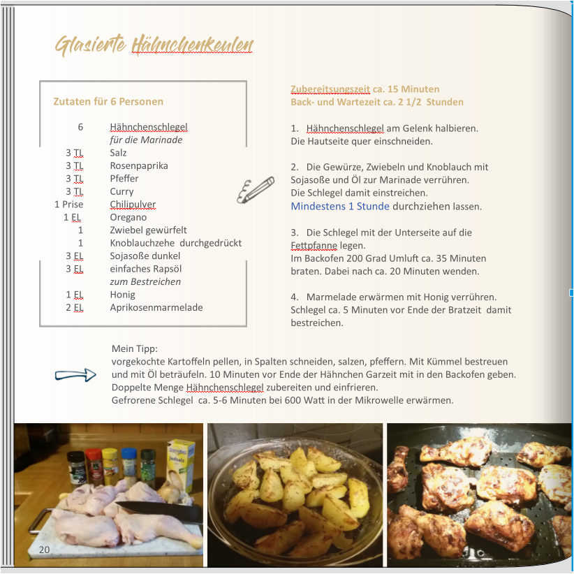 eine kleine Anmerkung hätte ich noch: Bei Deinem Bild ganz rechts unten ist am oberen Rand noch ein leuchtend blauer Bildschirm (?) zu erkennen, der den Blick auf sich zieht. Vielleicht kannst Du das Bild soweit heraus zoomen, dass nur noch die Hähnchenschenkel zu sehen sind. Ansonsten finde ich die Seite sehr gelungen. Das Rezept kann man m.E. gut nachkochen. Viele Grüsse