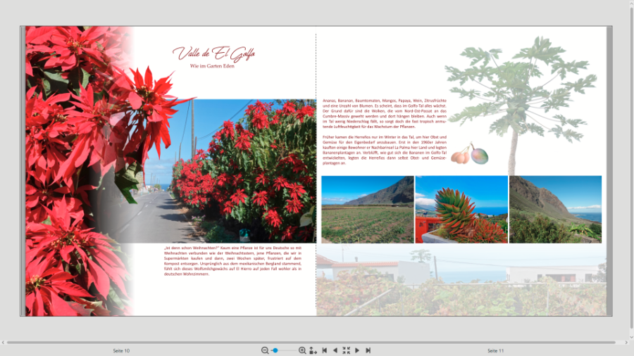 grundsätzlich gefallen mir beide Gestaltungsansätze der gezeigten Seiten gut, aber irgendwie scheint immer etwas unrund zu sein. Meine Gedanken dazu: Ich finde den Versuch, die Strommasten mit Verläufen/Masken zu "verstecken" auffälliger/unschöner, als das Bild pur zu zeigen. Also einfach Weihnachtshecke mit Masten, so wie es halt war. Wenn Du Dich dennoch daran stößt, würde ich das Straßenbild wohl gar nicht verwenden, sondern nur den großen Zoom auf die Weihnachtssterne mit der Freistellung dazu. Die gefällt mir sehr gut. Wenn Du das Straßenbild weglässt, würde ich die linke Seite des ersten Bildes verwenden, dort entsprechend nur die Weihnachtssterne mit Freistellung am linken Seitenrand und zusätzlich den gesamten Text, der jetzt auf 2 Seiten verteilt ist, platzieren. Auf der rechten Seite würde ich die Gestaltung übernehmen, die Du jetzt auf Bild 2 links hast, nur eben ohne Text. Wenn Du alle Bilder behältst, würde ich zusätzlich zu den verwendeten Masken auch die Schriftwahl und -platzierung überdenken. Momentan wirkt es wie zwei gleichwertige Überschriften, aber wenn ich es richtig sehe, verwendest Du 2 unterschiedliche, aber sehr ähnliche Schmuckschriften. Oder täuscht das? "Ist denn schon ..." und "Valle ..." scheint mir inhaltlich auch nicht gleichwertig zu sein, daher würde ich eher die ""-Variante für den Beckenbauer-Spruch bevorzugen. Und ich würde nicht rot als Schriftfarbe wählen, sondern eher ein graubraun aus den Bergen. Jetzt erscheinen mir Schrift und Weihnachtssterne zusammen irgendwie als roter "Overkill". Ich bin sehr gespannt auf Dein Buch. El Hierro ist für mich Neuland und ich bin entsprechend neugierig, wie es dort ausschaut. Liebe Grüße
