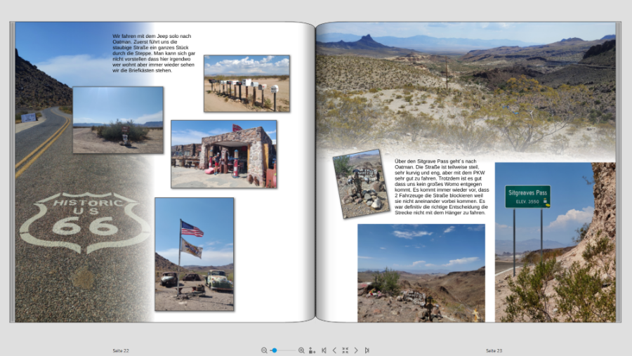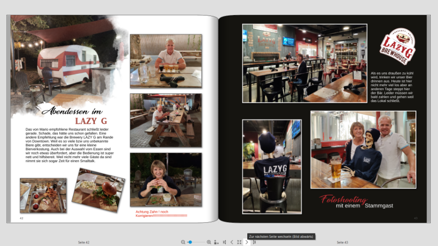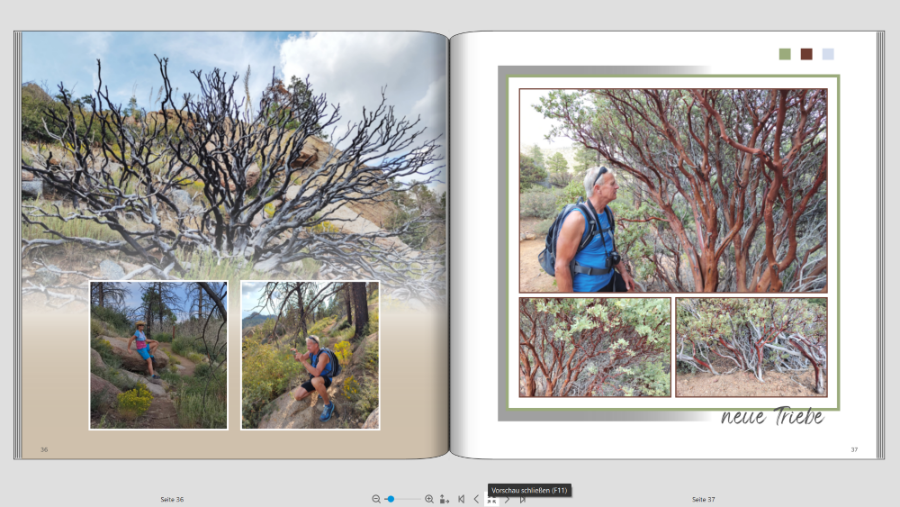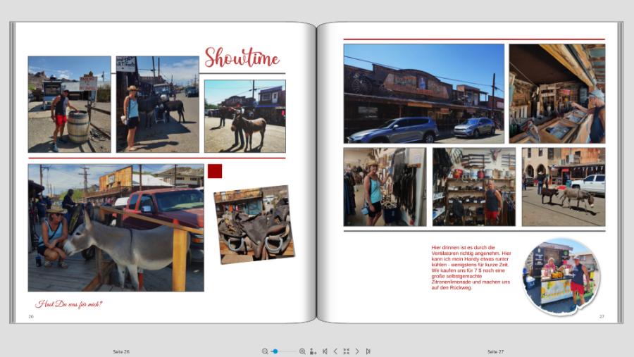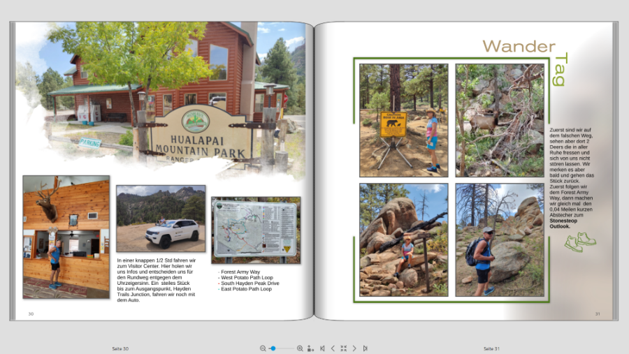 Ich bin mit meinem FB (Teil 1) von unserer Amerika Reise endlich in den letzten Zügen, jetzt kommt mein Mann daher und meint ich sollte doch unbedingt Fotopapier und dadurch Layflat machen. Jetzt hab ich logischerweise die Seiten so gestaltet, dass der Falz berücksichtigt wird. Also teilweise absichtlich mehr Abstand zum Falz. Bevor ich jetzt alles abändere, möchte ich bitte Eure Meinung dazu hören. Ich denke dass ich manche Seiten mit rel geringem Aufwand anpassen kann, aber bei anderen hab ich doch Bedenken dass es irgendwie "komisch" ausschaut. Ich häng Euch mal ein paar Seiten an damit Ihr einen Eindruck von meiner Gestaltung bekommt. jetzt kommen meine Problemseiten wenn ich auf Layflat wechsle Was sagt Ihr dazu? Würdet Ihr wechseln auf Fotopapier. Seitenzahl insgesamt momentan ca 130 Seiten. Das ist jetzt die Hälfte der Reise, Teil 2 fehlt noch komplett VG geniesser66