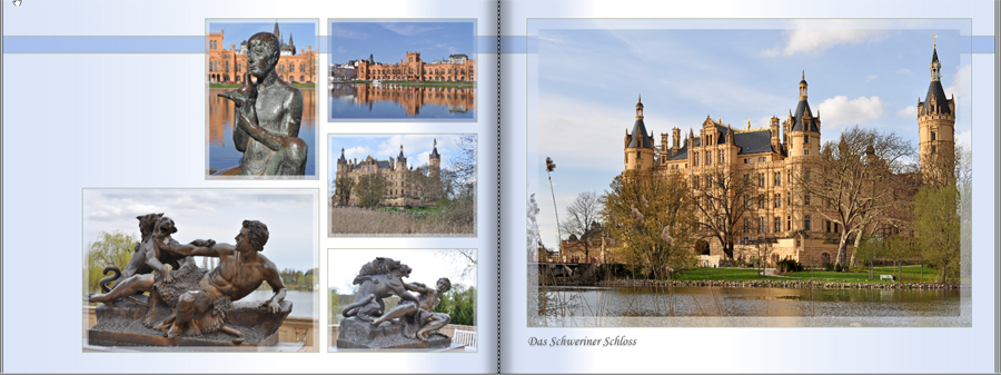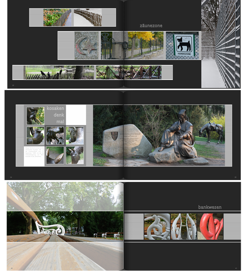 Re: 9. Dezember | Kategorie: SoftwareIn diesem Buch, das 2012 entstand und verschiedene Aspekte eines Wiener Parks zeigt, habe ich viel mit grau-weißen geometrischen Figuren rund um die Bilder experimentiert. Hier drei Seiten, wo die seitlichen Bildbegrenzungen mit Querstreifen gestaltet sind. Als ich mir die Seiten jetzt, mit ein paar Jahren Abstand angeschaut habe, fand ich sie nicht so schlecht. Der Punkt ist m.E: dass die Wirkung der Bilder durch die Deko-Elemente etwas zurückgedrängt wird.